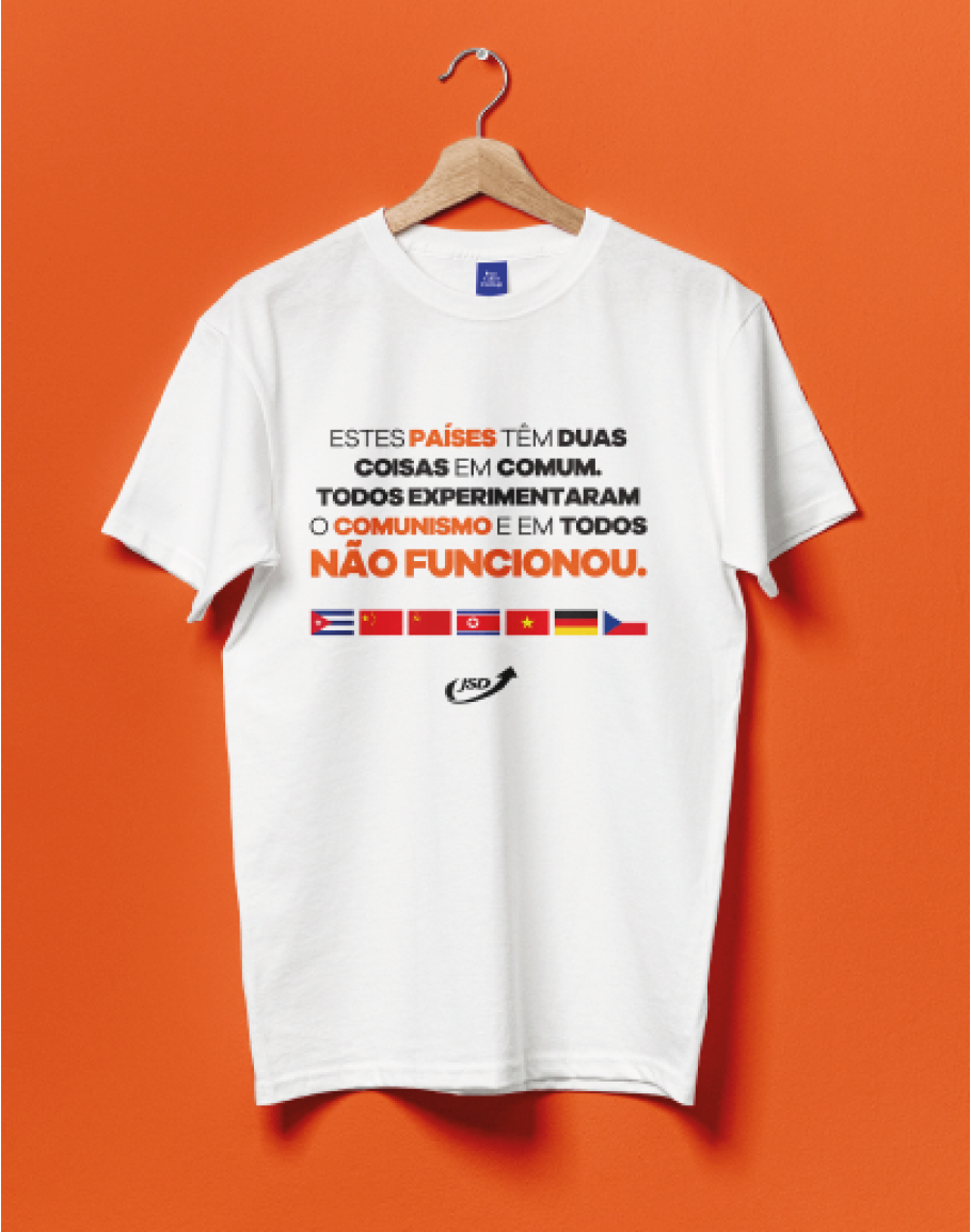 T-shirt com bandeiras de vários países e com frase "Estes países têm duas coisas em comum. Todos experimentaram o comunismo e em todos não funcionou"